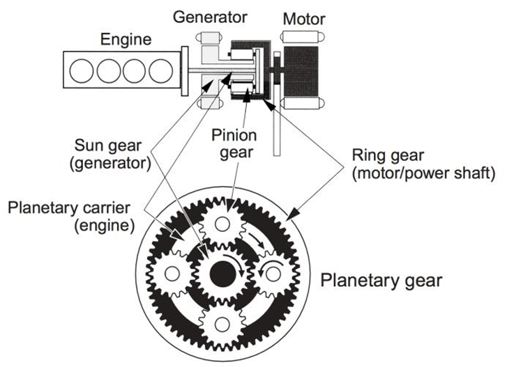 而丰田的THS系统,就是为了解决这一问题出现的。它通过太阳轮、齿圈、行星架三个旋转装置组成的行星齿轮,进行功率分流。通过这三个旋转装置相互转动,配合发动机、发电机、驱动电机工作,决定什么时候用电,什么时候发电,什么时候用油、用多少。
