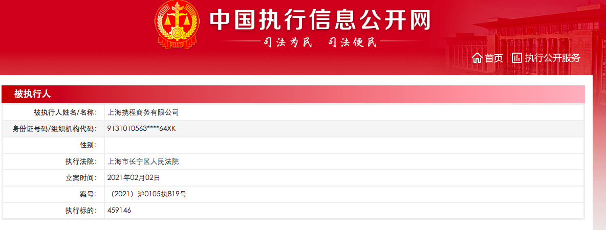 据中国执行信息公开网显示,2月2日,上海携程商务有限公司新增一条被执行人信息,案号(2021)沪0105执819号,执行标的459146元,执行法院为上海市长宁区人民法院。