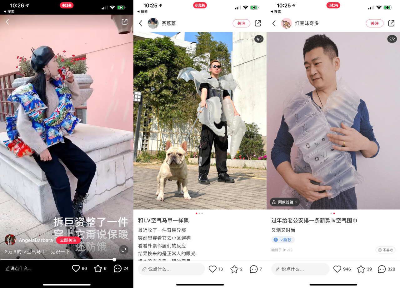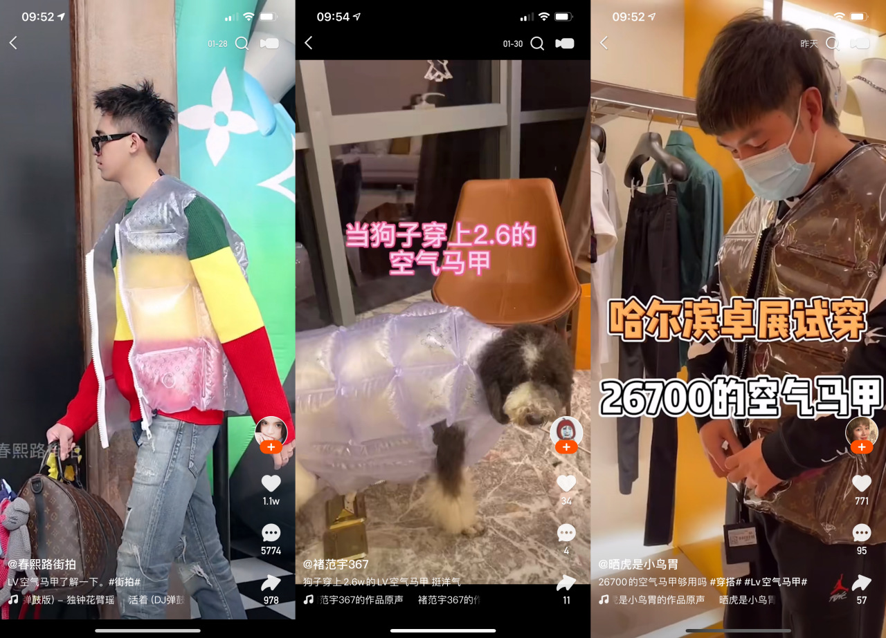 界面时尚在抖音和小红书等社交媒体上以“空气马甲”、“LV透明夹克”为关键词进行搜索时,发现已有许多博主购入并进行分享。与此同时,部分博主则已经用常见的防震透明塑料气垫和膨化食品包装袋来进行模仿,还调侃自己“斥巨资”购买了一件保暖又防饿的实用马甲。