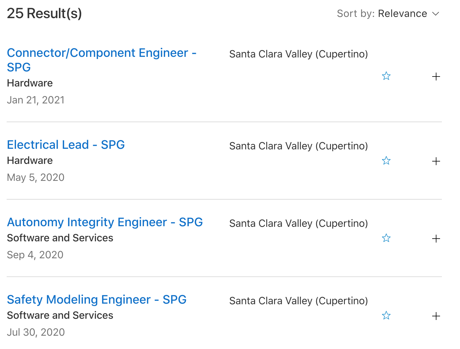 过去一年,苹果官网在SPG项目组开放了至少25个岗位,其中有19个岗位涉及硬件方面,5个涉及软件与服务方面,1个涉及机器学习与AI方面。所有岗位工作地点均在美国加州库比蒂诺市的圣塔克拉拉谷(前文提及三个岗位工作地也在此)。