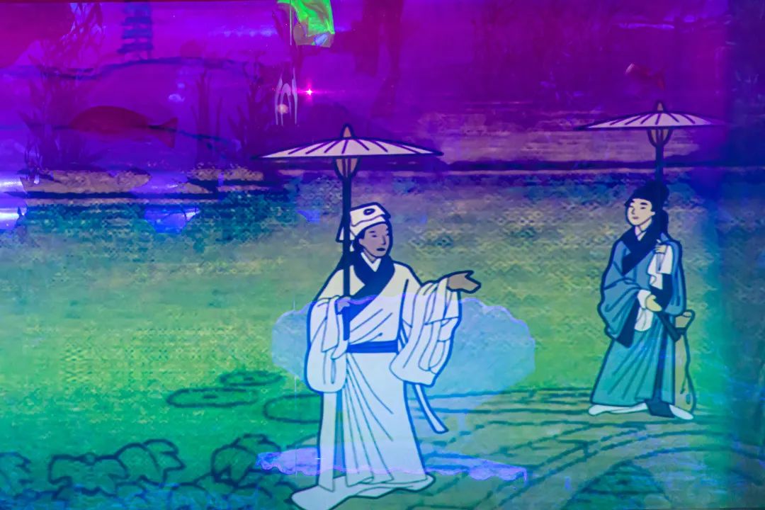 伴随着悠长的经典音乐,简洁含蓄的古代人物动画被投射到幕布上,在悠扬动听的解说中,“梁祝”二人身着黄色和红色的古代戏剧服装潜入水下,宛如两条人鱼般优雅自如。