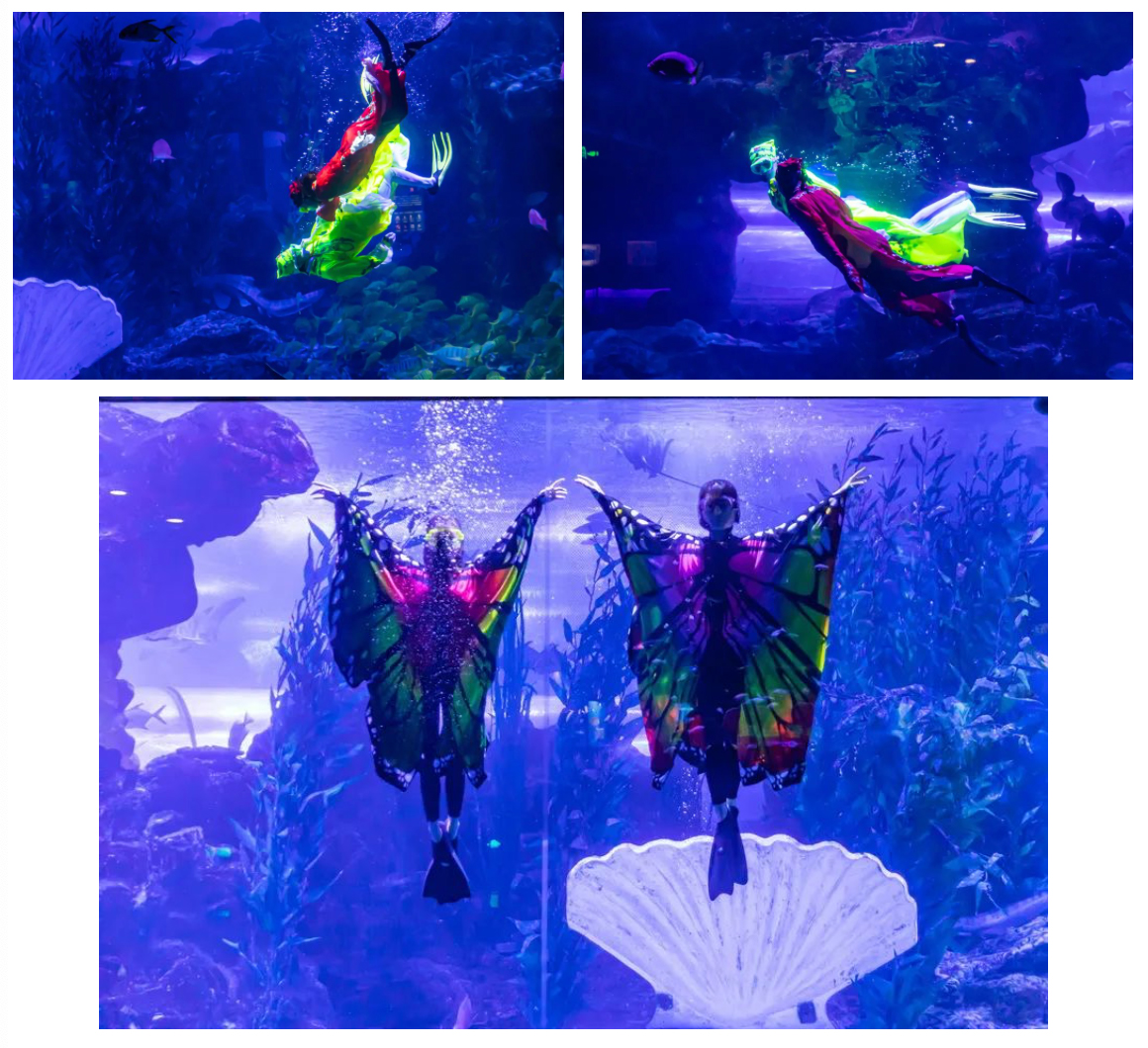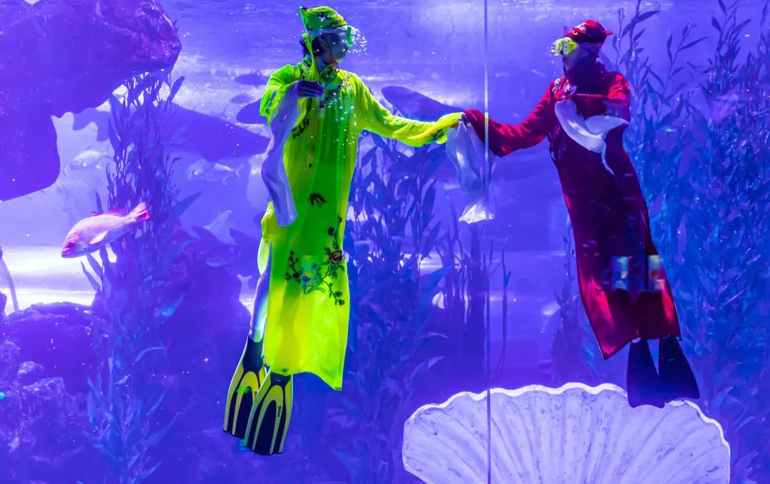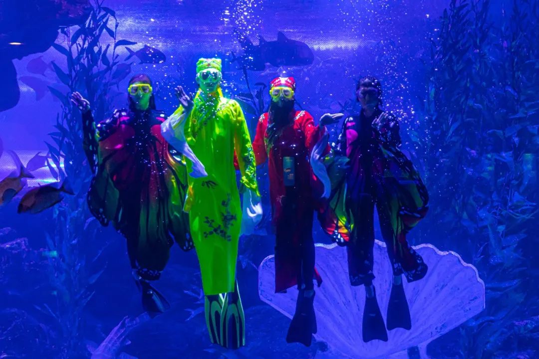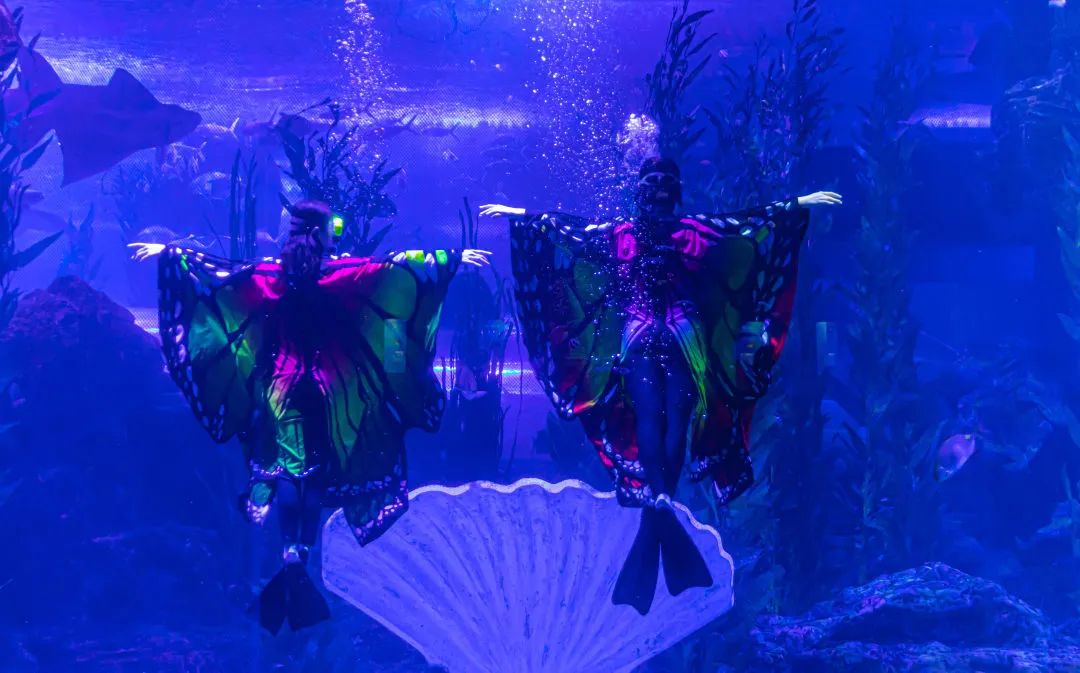 从“三载同窗”到“十八相送”,从“楼台一别”到“化蝶双飞”,伴随着灯光、音效的层层递进,跟随演员们水下精彩绝伦的表演,梁山伯与祝英台从求学相识到相知、相许,再至相恋相守、生生不息的爱情故事在湛蓝、神秘的海底世界被重新演绎、诠释,为观众们呈现出一场耳目一新的视听盛宴。