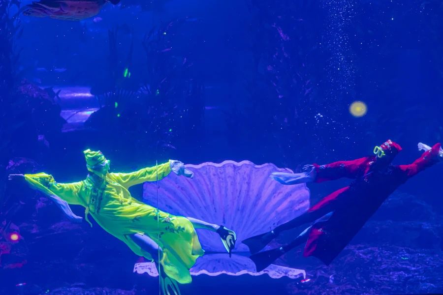 历时三个月精心策划,从原创动画视频到七彩光影打造,运用影像投影系统+高新动漫技术,结合高难度的水下动作编排与惊艳视觉呈现的海底“梁祝”,终于赶在2021年的春节和大家见面啦!