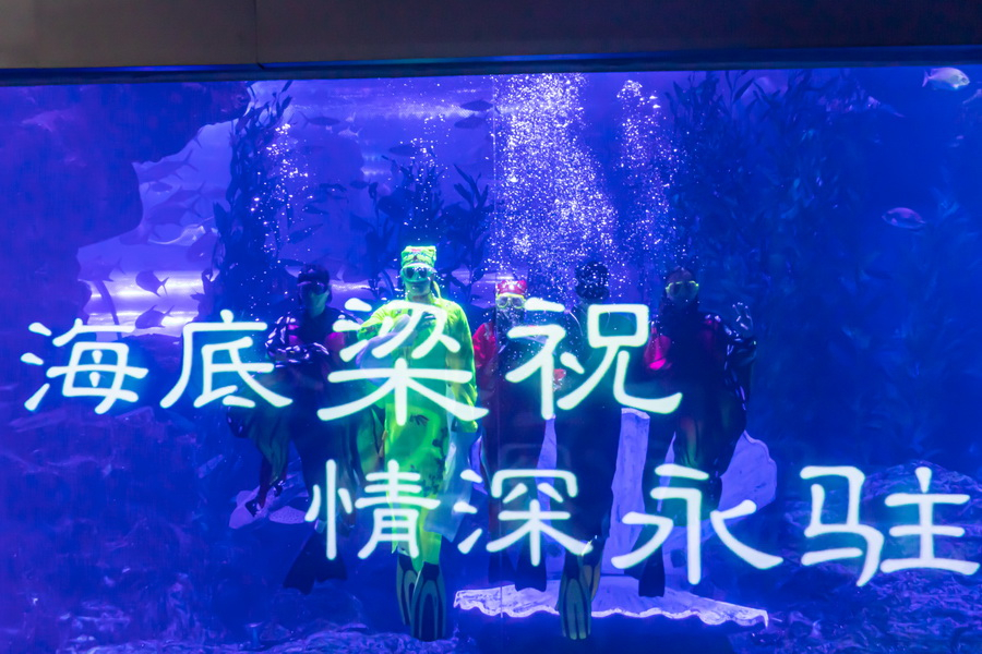 青岛海底世界中央表演大厅内,“海誓山盟”圆柱展缸与表演大屏幕遥相呼应,也为海底“梁祝”表演现场营造了浪漫缱绻的氛围。