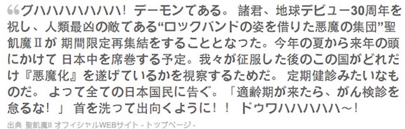 “捏哈哈哈哈,我是DEMON。诸君,为庆祝乐队登陆地球30周年,圣饥魔Ⅱ限期重聚,以审视被我们征服后,这个国家的恶魔化深入到何种程度了。就好像定期体检一样。特此昭告天下。”