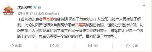 此前,@沈阳发布 微博1月13日援引沈阳市第六人民医院消息称,此轮沈阳新冠肺炎首例确诊患者尹某某核酸已转阴,但仍处于僵持阶段。沈阳市第六人民医院重症医学科主任吴云海接受采访时表示,核酸转阴只是一个诊断上的改变,患者仍需要一个治疗的过程。目前仍属于危重型。