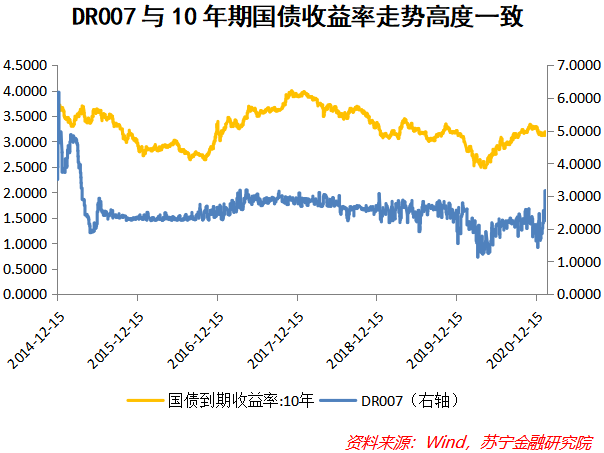 二是作为央行重点培育的货币市场流动性指标,DR007是央行重点监测的公开市场业务指标,因此DR007反过来是央行投放流动性的原因,由于DR007是市场真实成交得到的结果,很具有参考意义,并且随着银行间同业拆借市场的日渐成熟,它所能反映的流动性真实性越来越强,因此虽然短期的DR007波动不可避免,但长期偏离7天逆回购的可能性很小,因为这不符合DR007作为政策和市场之间的“桥梁”意义,也不符合当前“稳字当头,不急转弯”的货币政策取向。
