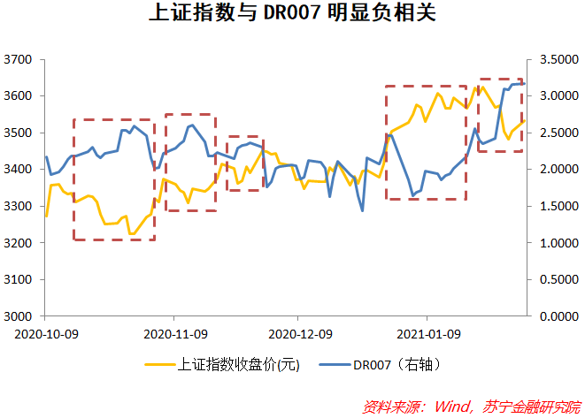 首先,流动性是股市增量资金来源。从股市表现看,近期上证指数和DR007在很多短周期中都呈现了负向关系。DR007指的是存款类金融机构间以利率债为质押的7天回购产品利率,利率越高,意味着银行借钱成本越大,流动性越紧。