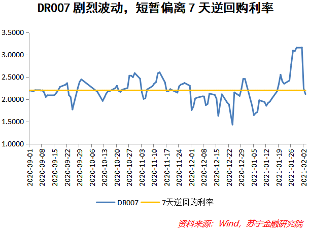 2021年以来,尽管央行每日都开展逆回购操作,但其中有10天是开展了20亿元、50亿元地量投放操作,尽管近日恢复大额投放,但由于前期到期量较大,资金依然处于净回笼状态,净回笼资金在上周超过4000亿元。加之1月末财政支出和1月缴税期叠加,现金需求量大幅增加,导致了资金价格飙升。2月1日的DR007达到了3.1656%,创下了近5年来的新高。