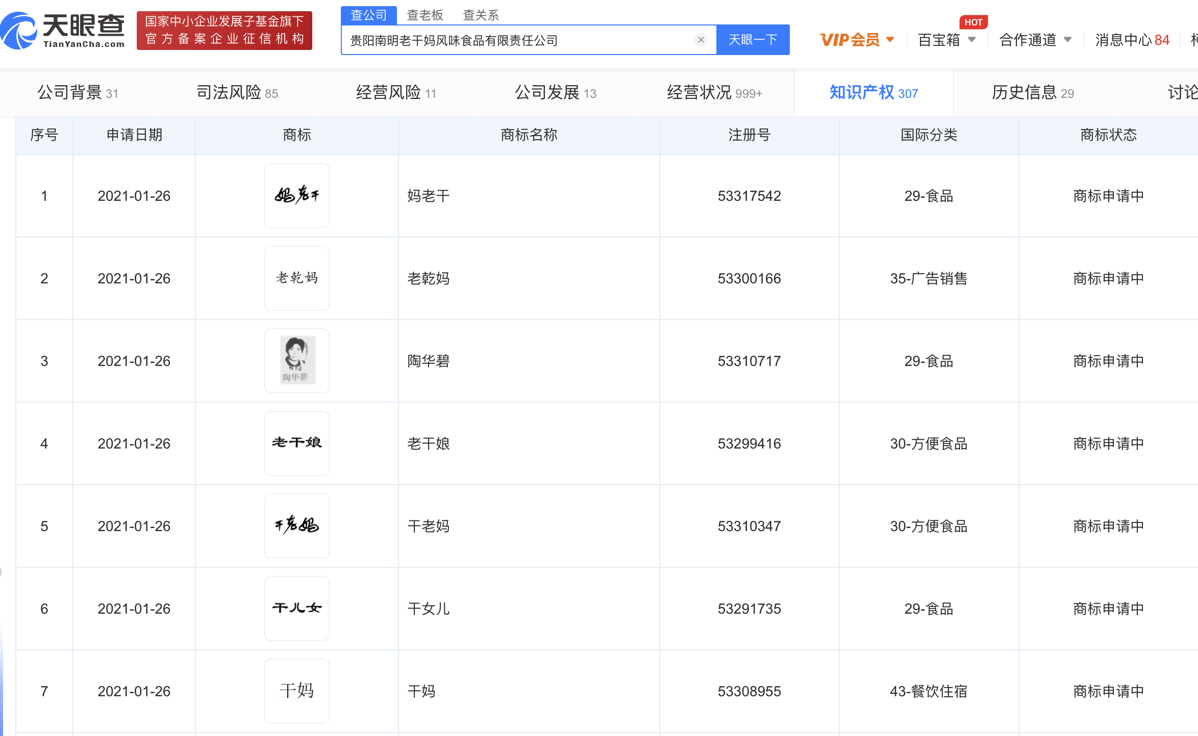 据天眼查APP显示,1月26日,贵阳南明老干妈风味食品有限责任公司新增多条“老干妈”“老乾妈”“妈干老”“老姨妈”“干妈”“陶华碧”等商标信息,国际分类涉及广告销售、餐饮住宿、建筑修理等,申请日期为2021年1月,目前商标状态为“商标申请中”。