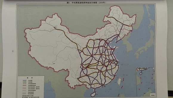 从第一张彩图可以看出,在既有高速铁路的基础上,规划中的中西部地区以及城际间交通通道明显增多,全国高速铁路网纵横交错: