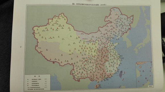 在第二张彩图上,蓝色三角块标注有28个在建运输机场;红色方块标注有163个规划新增运输机场;研究布局运输机场有11个……