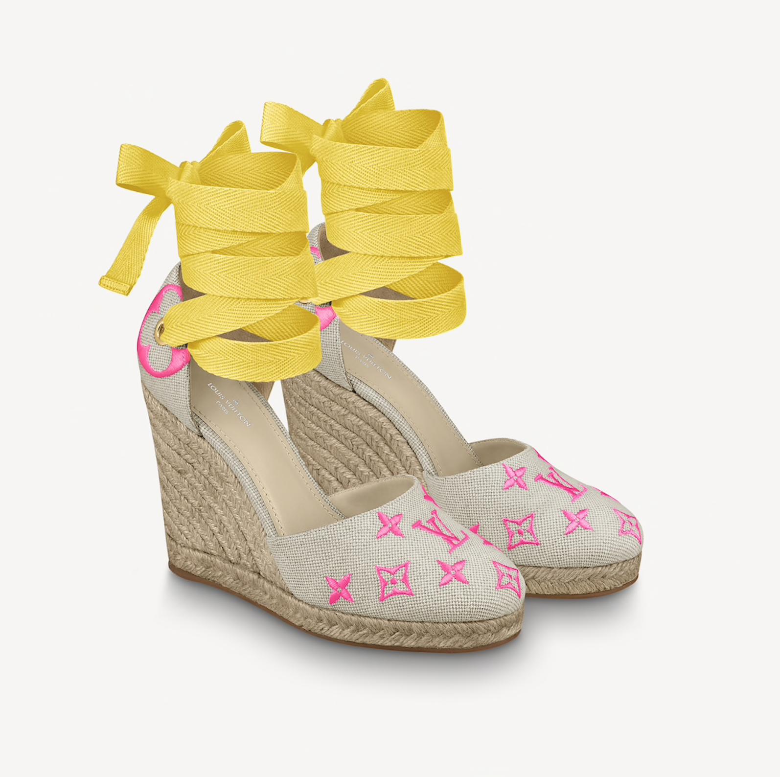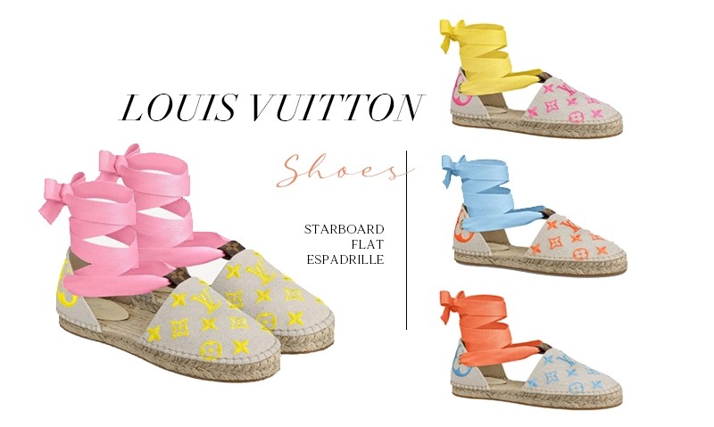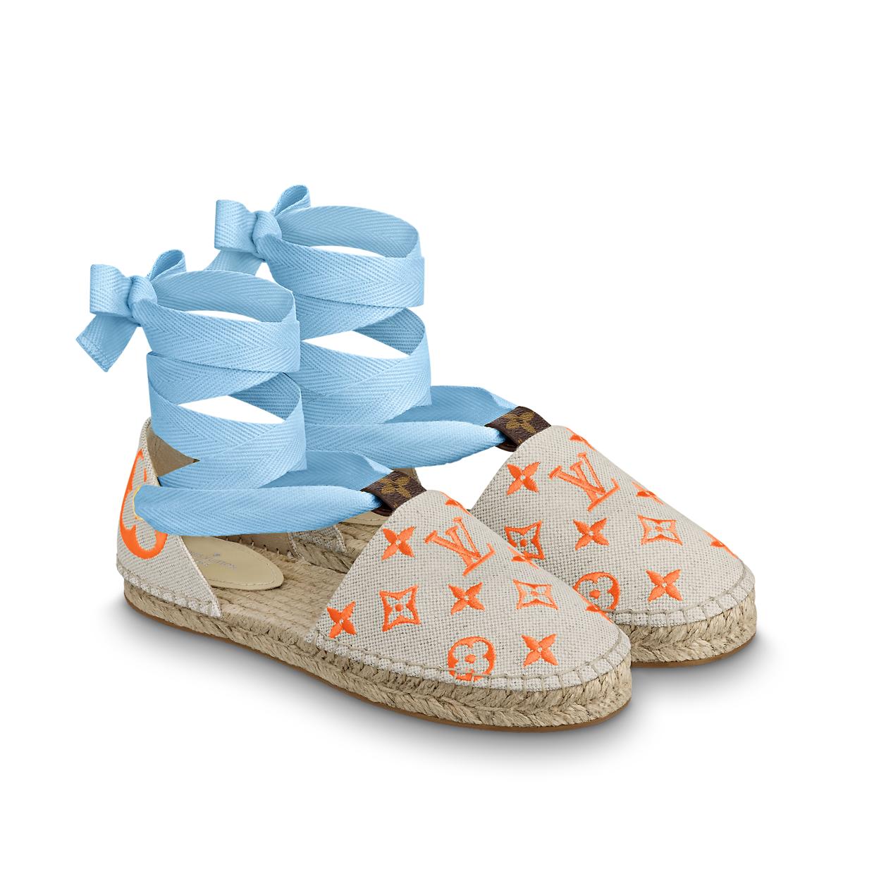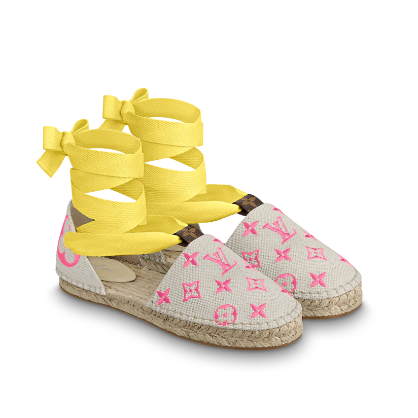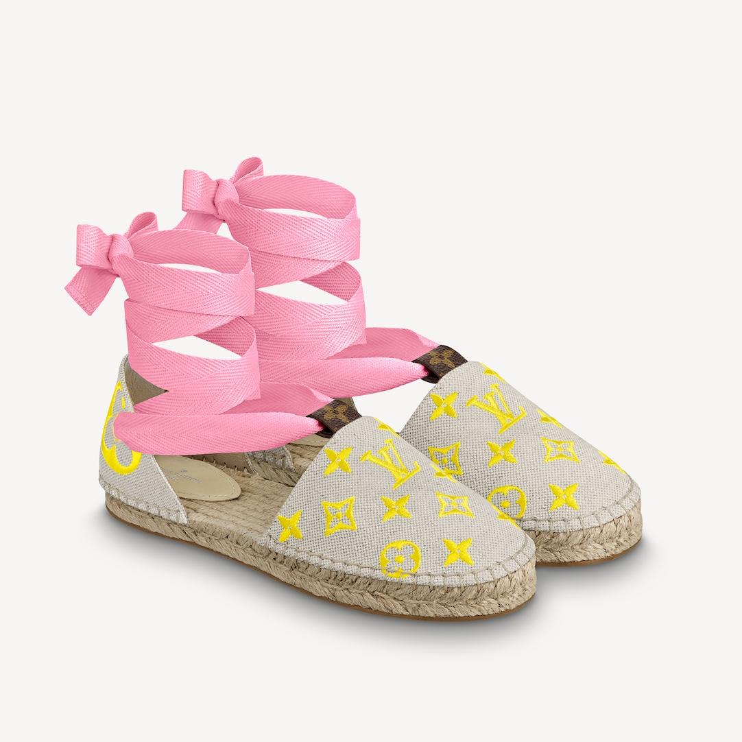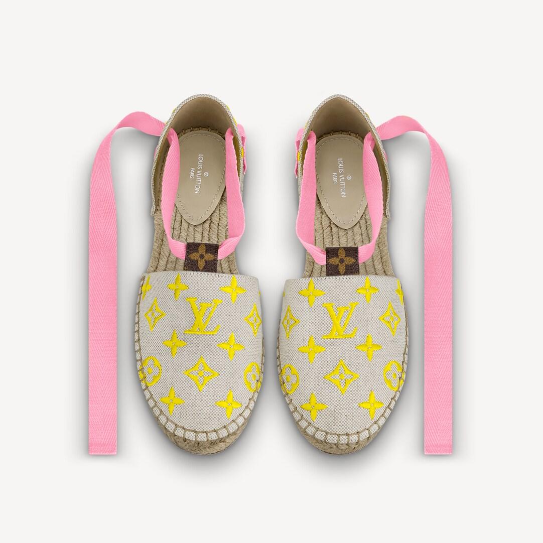 Starboard草编鞋系列春夏氛围浓厚,采用了亮粉红、橙色、蓝色、黄色等具有夏日感的清新色彩。此外,还别出心裁地融入了芭蕾舞鞋的绑带元素。彩色丝带与刺绣帆布上的标志性Monogram图案互相映衬。