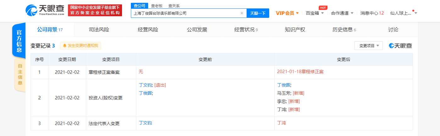 据天眼查APP显示,2月2日,上海丁俊晖台球俱乐部有限公司发生工商变更,丁俊晖的父亲丁文钧退出公司法定代表人,法定代表人由丁鸿接替;此外,股东新增马玉芳、李忠和丁鸿。