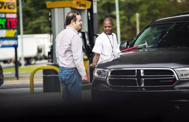 还需要加一次油我们才能顺利抵达亚特兰大。当我们第二天在亚拉巴马州的普里查德停下来加油时,21岁的轮胎工Mario Gibson飞奔出来为我们服务。然后我们如法炮制,向Gibson讲述了我们的“悲惨故事”,问他借20美元用来加油。他摇着头计算片刻后告诉我们,他真的只能借我们10美元。而且我们必须让他好好拍几张照片。他刷了借记卡给我们加了油之后,我开车带他兜了一圈停车场,看得出他很着迷。