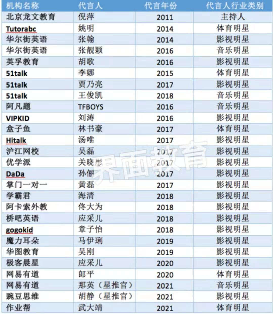 体育名人之外,娱乐明星(包括影视、音乐领域)备受在线教育机构的青睐。据界面教育不完全统计,2011至2021年间,已宣布代言人的教育机构中,娱乐明星代言人的占比约63%。