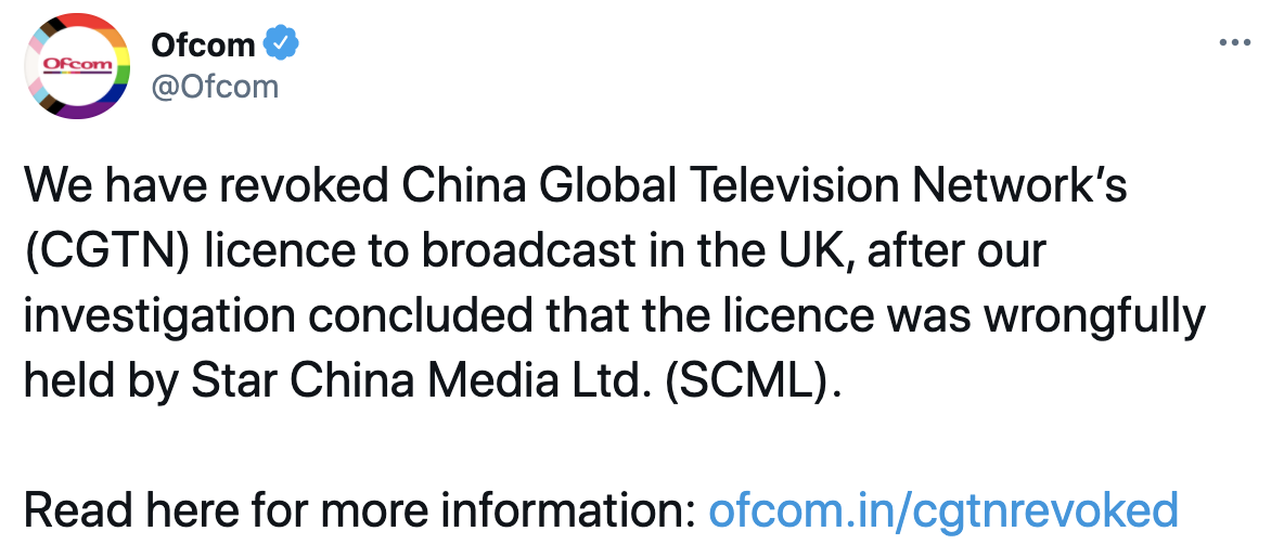 英国通讯管理局(Ofcom)4日发布声明,称当天已撤销中国国际电视台(CGTN)在英国开展广播的执照。Ofcom称,根据此前调查得出的结论,该执照由Star China Media Limited(SCML)不当持有。