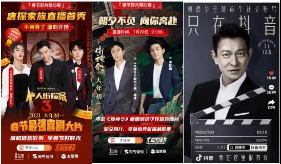在电影春节档预售的第六天,抖音也正式祭出今年的“4亿电影福利”,一举拿下七大影片合作,自今日起刘德华、贾玲等一众明星都将走入抖音电影直播间。而在此之前,从1月初开始,今年春节档七大片方已经陆续成为直播间的常客。