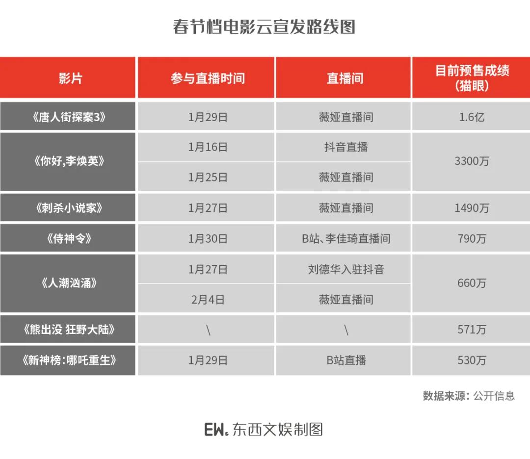 作为今年声量最大的两部影片,《唐探3》和《你好,李焕英》的主创们在同一时间段,纷纷前去薇娅直播间“直播带票”,其中《唐人街探案3》预售更是突破行业新纪录,在薇娅直播间售出105万张电影票。1月16日,《你好,李焕英》在线上线下联动短视频达人与观众进行直播路演活动,电影主创们和各个短视频达人进行游戏互动,线下十一个城市在超过一千名观众在影院同步观看,直播期间在线人次超150万。
