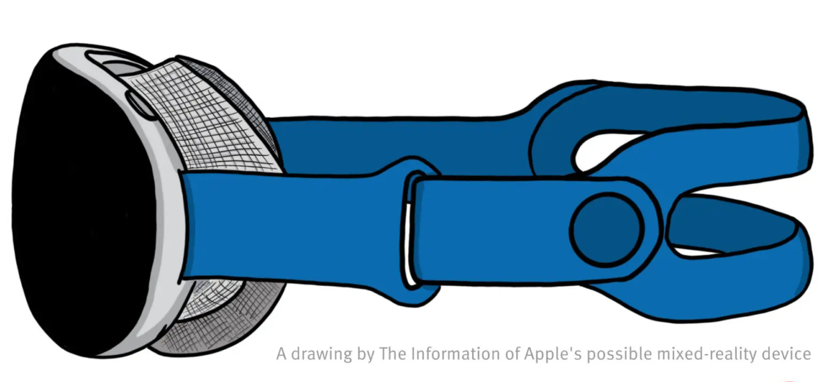 The information声称已看到苹果头显后期原型图片,头显面部界面由轻质网状材料制成,能挡住所有外部光。头带内置空间音频,可进行替换。苹果头显通过网状织质材料与可替换头带连接到与面部接触的光滑弯曲的遮阳板。 The information还画出了该头显的基本图形: