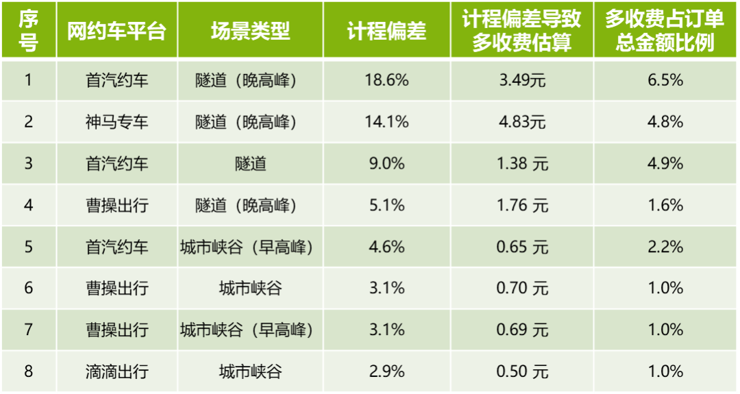 消保委根据《网络预约出租汽车计程计时技术要求(试行)》,模拟消费者在网约车平台下单,每个平台进行11次测试,覆盖高峰期和非高峰期两种时间段,包括机场线、城市峡谷(道路两侧楼宇较密集的区域)、林荫路、高架上、高架下、隧道等6种典型场景,并将每次测试订单中平台用于结算的里程和时长,与标准检测设备测试出来的里程和时长进行对比,以反映计程、计时误差。