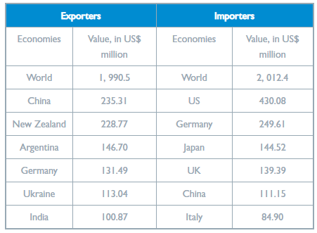 全球蜂蜜主要进出口情况,资料来源:ITC Trade Map, 2020, 以US$ million为单位