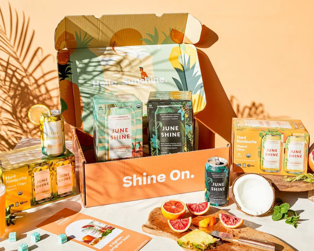 总部位于圣地亚哥的Juneshine公司推出多款以蜂蜜为甜味剂的含酒精康普茶饮品,其中包括血橙薄荷味硬康普茶和午夜陶醉康普茶鸡尾酒,二者中酒精含量均为6%,且均添加了品牌特色的June茶(June茶与康普茶的区别在于June茶以蜂蜜代替蔗糖来为茶中的益生菌提供能量)。