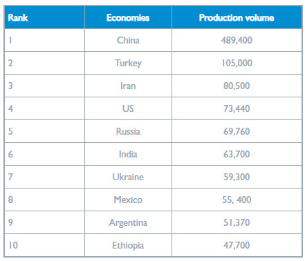 蜂蜜主要生产国,资料来源:Statista2020, 以公吨为单位