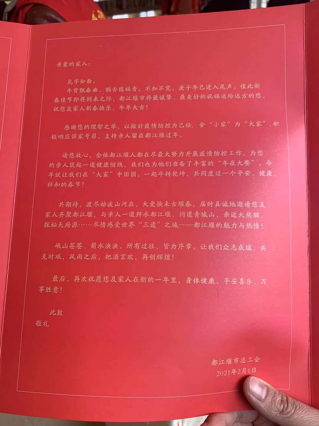 回家过年,不仅是传统,更是情感的需求。在外打拼一年,大家都等着回家过年,这是奋斗的动力,更是来年再出发的信心。我们相信,今年,都江堰的年味会更浓,正是因为有来自五湖四海在都江堰拼搏奋斗的他乡人,他们舍弃了浓浓的乡情思绪,放缓归家脚步,为防疫牺牲团圆。即便没有冲在抗疫一线,他们每个人都是抗疫英雄。我们要给所有留在都江堰过年的省外职工说一声:感谢你们的付出,每个人都了不起。