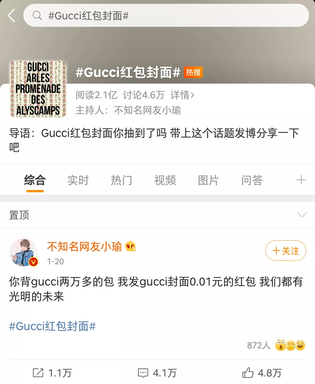 先说下热搜的事儿,被送上热搜的是Gucci红包封面,到目前为止,红包封面的话题已经有2.1亿阅读。在话题下,讨论的内容也是十分精彩,大家都在分享自己的状态,有不少人在刷屏抢到了,抢到了,也有人说手气慢,但不管怎样,从品牌角度来说,这场营销战役赢了。