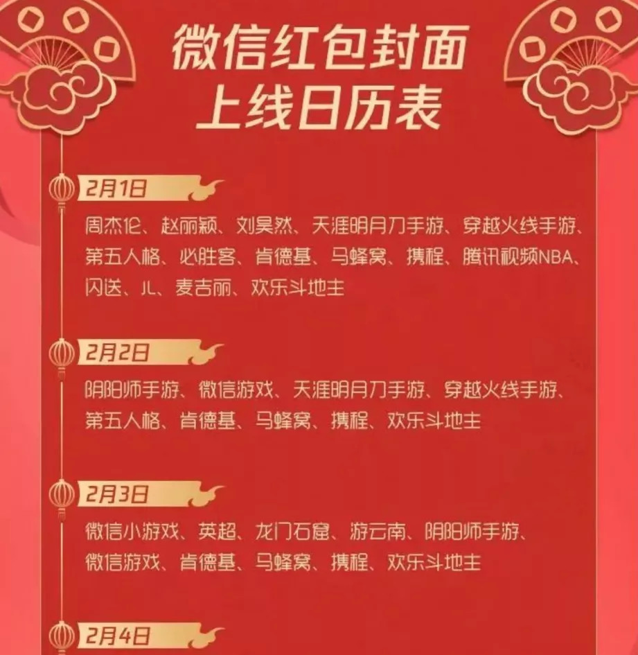 另一个红的表现就是出了日程表。不知道微信红包官方团队有没有KPI,应该也有,不然怎么会出品牌红包封面的日程表,一边限量领取,一边出了日程表,各大品牌发出红包封面的时间点都安排的满满的。当然,微信红包肯定也没有什么坏心思,马上春节了,新年大酬宾,为用户带来免费限量福利,还能为微信早早截“扫福“的流。
