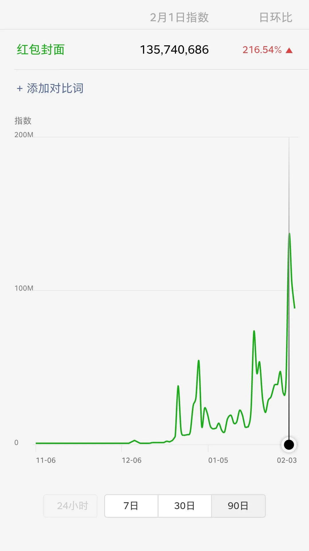 从微信指数上也可以看到,红包封面的搜索指数在2月1日达到了新的峰值,搜索量过亿,当天有不少品牌和明星红包封面发布,而这天也是支付宝每年保留的春节活动“扫福”的第一天。