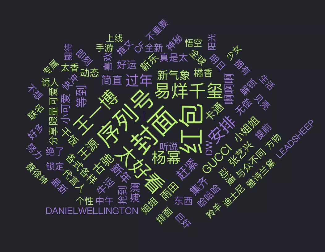 除此之外,根据时趣洞察引擎数据显示,在微博上网友们也在纷纷讨论红包封面,可以看到和红包封面紧密联系的热门关键词有“易烊千玺、杨幂、王源、王一博、张艺兴”等,还有“太好看、绝了、抢到、安排、赶紧、啊啊啊”以及“牛运、新年”等,这几类关键词正好可以透露出品牌微信红包的营销策略。