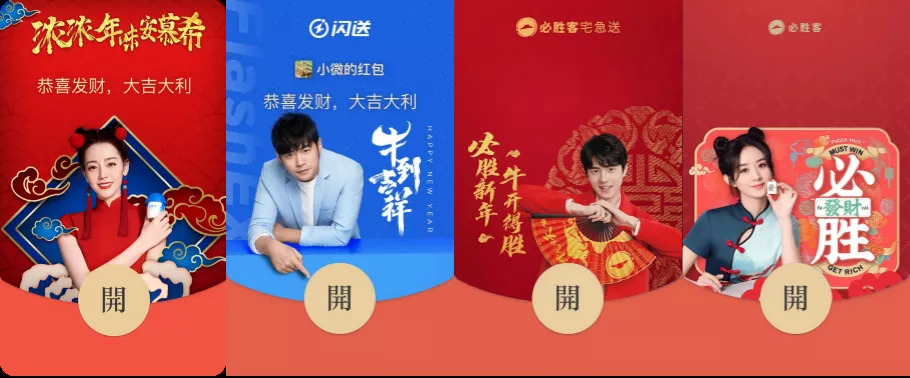 首先是品牌+代言人春节红包组合。品牌使用明星代言人海报做红包图,比如雅诗兰黛&杨幂、蒂芙尼&易烊千玺、闪送&周杰伦等等。