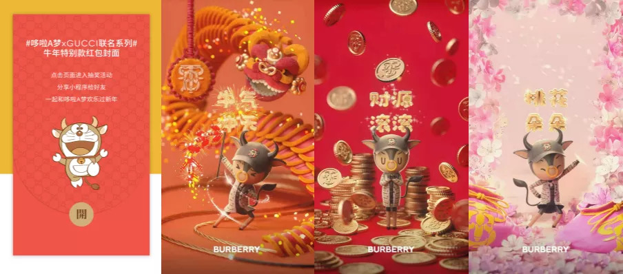 这一类以奢侈品牌为主,也是目前在社交平台上广受欢迎的红包,颜值取胜,比如Gucci、巴宝莉。对于奢侈品品牌而言,这是一场和年轻人互动交流的一次很好的机会。视觉上不受春节主题限制,反而扩大了红包使用的场景,不仅传达品牌的年轻化、个性化,同时,以红包封面为载体打入到年轻人群体中。这应该是奢侈品品牌在红包封面大战中最大的收获,尽管有的人说,0.01块钱的红包封面来自于Gucci,但丝毫不影响两万多的包也来自Gucci。