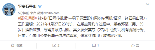2月5日,@平安石景山 微博发布《情况通报》:针对近日网传视频“一男子辱骂殴打网约车司机”情况,经石景山警方工作查明:2021年1月27日23时许,在乘坐网约车过程中,乘客郭某(男,39岁)酒后滋事,辱骂并殴打司机,其女友张某芬(27岁)也对司机有踢踹行为。目前,石景山公安分局已依法对郭某、张某芬作出行政拘留处罚。