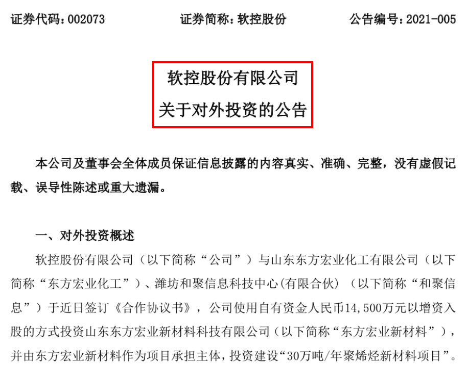 就在发布人事变动公告的当天,软控股份还对外发布了一则项目投资公告。根据公告内容显示,软控股份使用自有资金1.45亿元以增资入股的方式投资山东东方宏业新材料科技有限公司(以下简称:东方宏业新材料),并由东方宏业新材料作为项目承担主体,投资建设“30万吨/年聚烯烃新材料项目”。