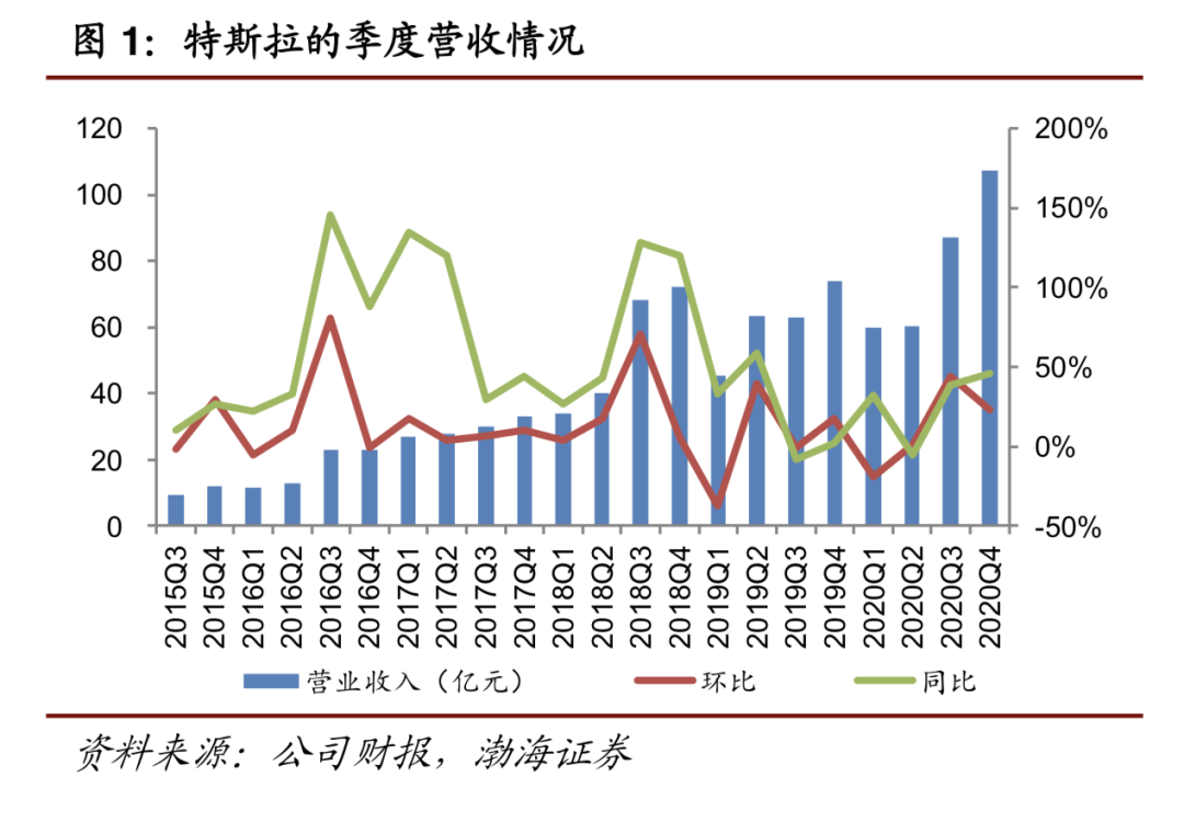 具体来看,2020年Q4,得益于汽车交付量和储能等其他业务的增长,特斯拉实现营收107.44亿美元,同比增长45.50%,环比增长23.34%。其中,Q4汽车产量与交付量分别同比增长了71.38%和61.17%,带动汽车销售收入同比增长47.06%至90.34亿美元。
