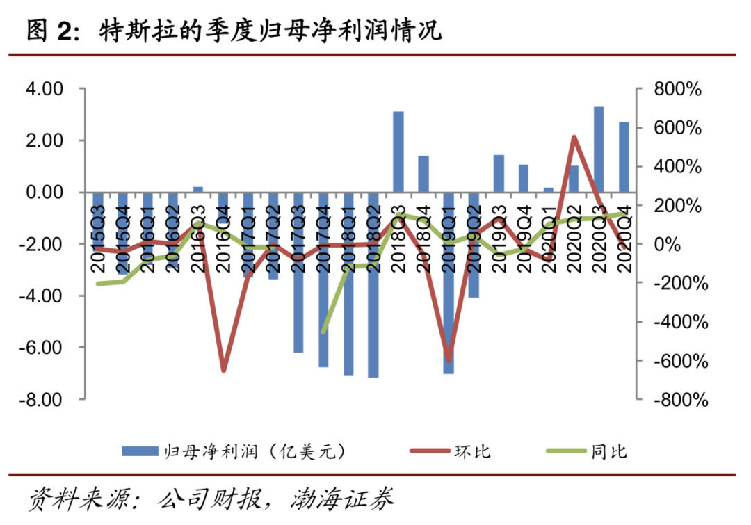 受此影响,2020Q4,特斯拉毛利率为19.2%,相比Q3 23.5%的毛利下降了4.3个百分点,而且也创下了2020年以来最低的毛利率水平。2020Q4,特斯拉归母净利润为3.31亿美元,连续第六个季度盈利,虽然同比增长了157.14%,但环比下滑了18.43%。