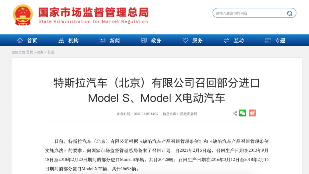 在美国和德国监管机构的调查下,特斯拉宣布对旗下车型进行召回。2月2日,特斯拉公司宣布,由于触摸显示屏存在导致某些安全功能缺失的问题,将召回约13.5万辆Model S/X。2月5日,特斯拉(中国)也宣布召回部分进口Model S、Model X电动汽车,共计约3.6万辆。