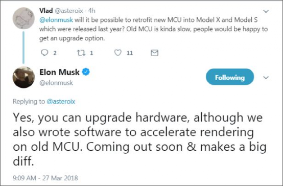 过去几年,特斯拉对这个问题的处理方式仅仅是通过升级的方式试图优化性能。2018年,当被问及是否支持MCU升级时,马斯克在推特上给出了肯定的答复。然而直到2020年3月,特斯拉才正式在美国市场推出了这一升级计划,只有在2018年3月之前的Model S和Model X可以享受这一升级,而且车主必须得付出2500美元的升级和安装费用。