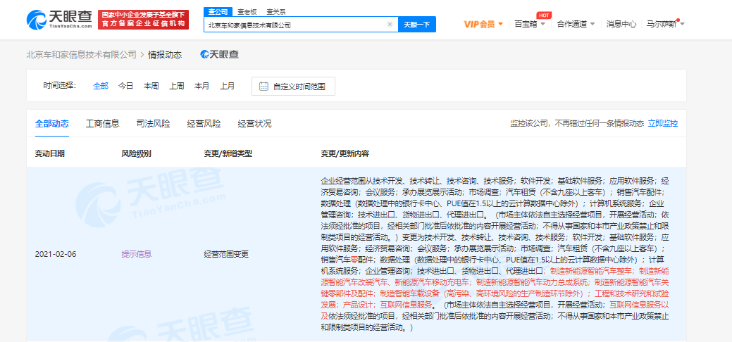 据天眼查APP显示,2月6日,北京车和家信息技术有限公司发生工商变更,公司经营范围新增制造新能源智能汽车整车;制造新能源智能汽车改装汽车、新能源汽车移动充电车;制造新能源智能汽车动力总成系统;制造新能源智能汽车关键零部件及配件;制造智能车载设备(高污染、高环境风险的生产制造环节除外)等。