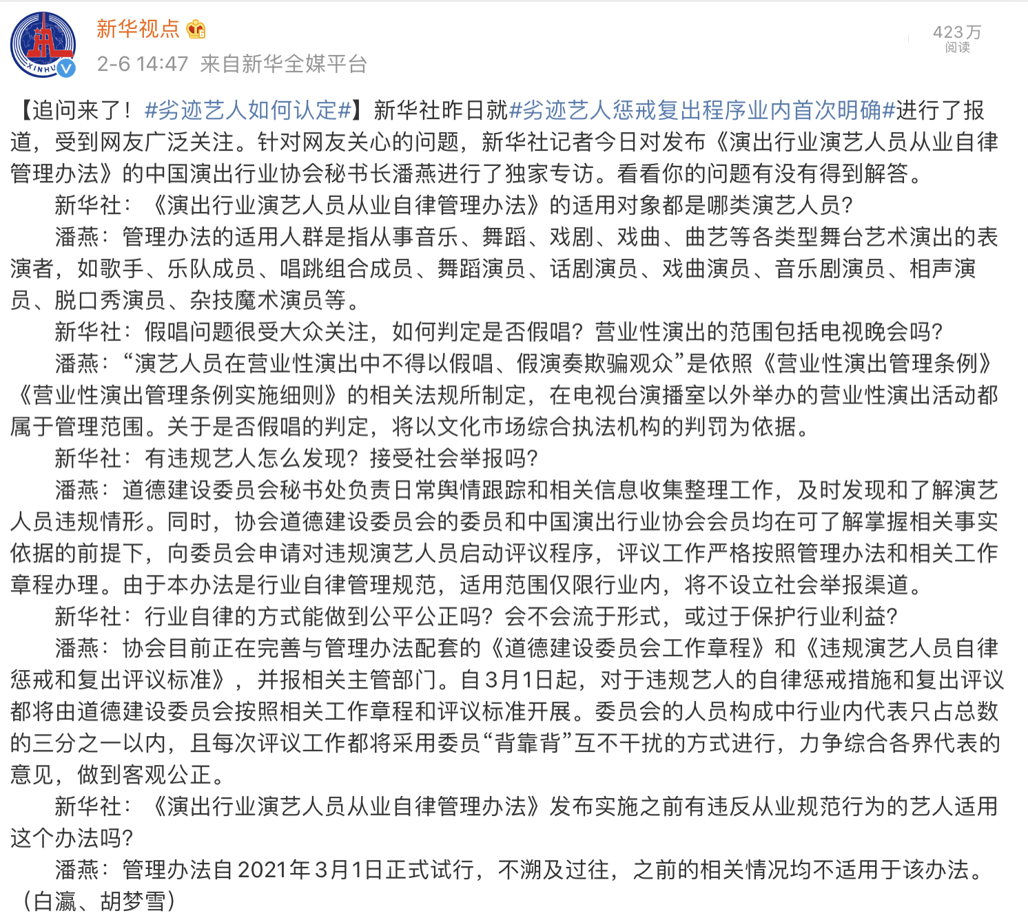 2月5日,中国演出行业协会发布《演出行业演艺人员从业自律管理办法》。根据管理办法, “劣迹艺人”将受到协会会员单位1年期限至永久期限的联合抵制,且须在联合抵制期限届满前3个月内提出申请,经同意后才可继续从事演出活动。