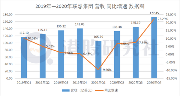 财报显示,联想集团2020年第四季度营收172.45亿美元,相比上年同期的141.03亿美元增长22.29%,环比上个季度的145.19亿美元增长18.78%。