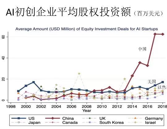 总体投资额较大但企业数量相对较少,致使中国AI初创企业的平均股权融资额呈现出远远高于其他国家的特点。报告显示,中国AI企业初创企业平均股权融资额在2018年已经达到超过6000万美元,同期美国AI企业这一数据仅为不足2000万美元。