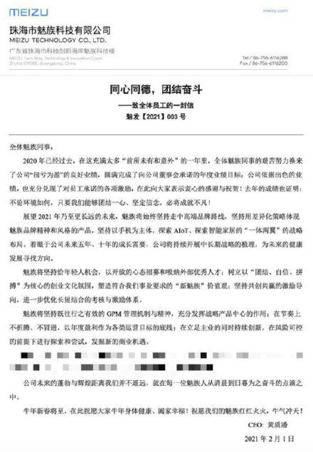 一份魅族于2月1日发布的全员信显示,魅族CEO已更换为黄章的亲弟弟黄质潘。他表示,魅族2020年完成业绩,实现扭亏为盈,未来将会继续坚持走中高端路线,差异化的策略。