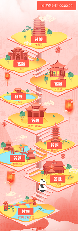 2月11日至16日,青城山-都江堰景区将开启“H5线上闯关,云守岁抢福袋”活动,广大市民朋友及游客可在除夕夜当晚8点通过青城山-都江堰景区官方微信公众号进入活动通道,参与互动闯关答题游戏,开启“云旅游”“云守岁”模式,解锁青城山-都江堰人文历史等方面知识,登顶老君阁,即可参与抢福袋活动。玩游戏,赢奖品,与青城山-都江堰景区一起进入“云守岁倒计时”。