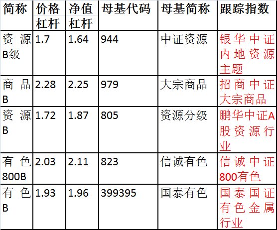 房地产分级(近期已经癫过,现在正在回调中)、资源与大宗商品分级(有色神马的blabla……)、钢铁分级、煤炭分级,需要提醒的小伙们的是,如果看好“周期天团”的后市表现,关键是要密切跟踪分级基金所跟踪的指数,分级基金跟踪的指数决定了分级基金的杠杆份额的走势。如果你近期看好和大宗商品有关的分级基金,可以选择价格杠杆高、跟踪指数走势强劲、远离下折的、流动性好分级基金。