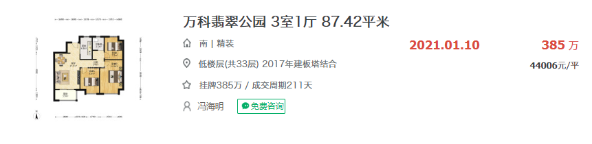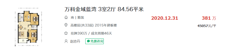 目前据链家网数据显示,两小区近期的成交房源均价均超4.4万/㎡。其中,万科金域蓝湾于2020年12月31日成交了一套建面约84.56㎡户型,单价更是高达45057元/㎡!
