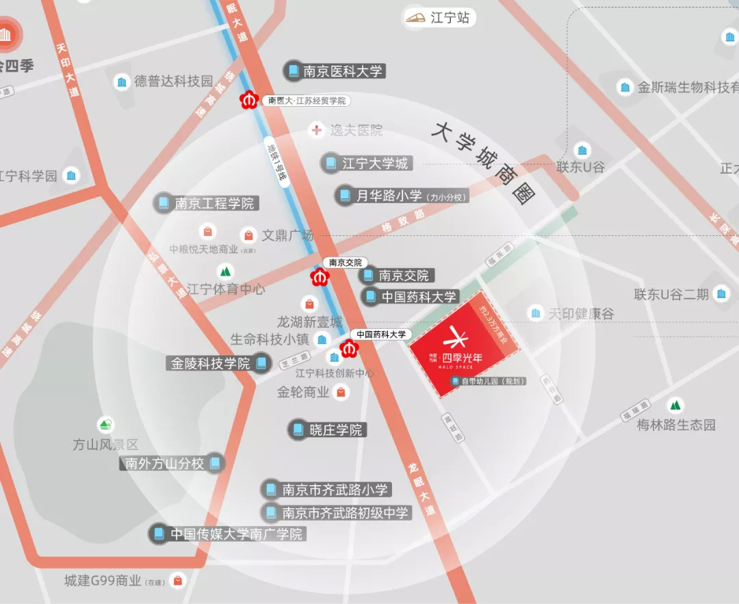 在教育资源上,大学城区域内聚集约15所大学,如南京医科大学、中国药科大学等,超20万大学生,为区域乃至南京储备了大量的人才和人口。